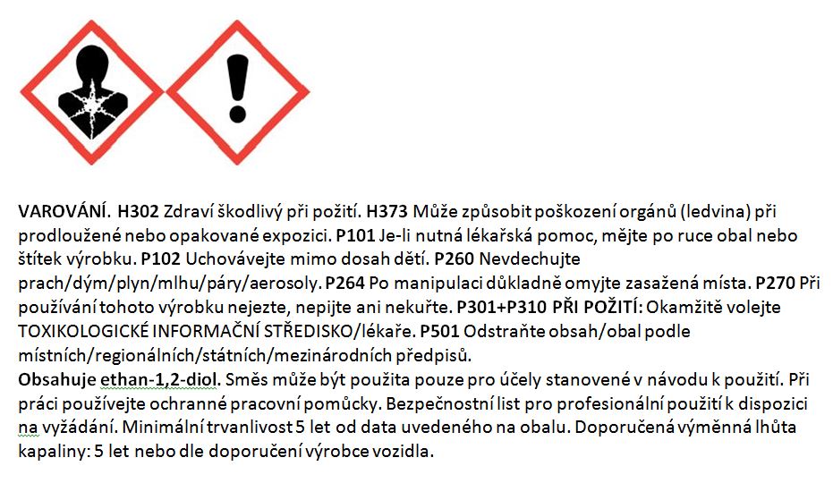 EN: State-of-the-art multifunctional concentrated coolant based on monoethylene glycol and superior silicate, phosphate and organic (Si-OAT) additives for internal combustion engines (ICE), hybrid vehicles and indirect cooling systems of battery electric vehicles (BEV). It meets the requirements of the VW TL 774 L standard for use in VW, ŠKODA, AUDI and SEAT vehicles and replaces the coolants of the previous VW TL 774 J/G/F/D/C specifications (G13, G12++, G12, G12+, G11). It contains highly effective corrosion inhibitors to protect the vehicle cooling system, stabilisers and agents to ensure minimal foaming of the mixture. Due to its composition it has excellent cooling and anti-corrosive properties at low and high temperatures and is miscible with all monoethylene glycol based fluids, however we recommend using one type of coolant to ensure maximum effectiveness of the corrosion inhibitors. Contains silicates to protect selected aluminum alloys. It does not contain harmful additives such as nitrates, amines and thus contributes to better environmental protection. The liquid must be diluted to the required level according to the table on the packaging before use. When using the fluid, follow the requirements of the car or engine manufacturer.