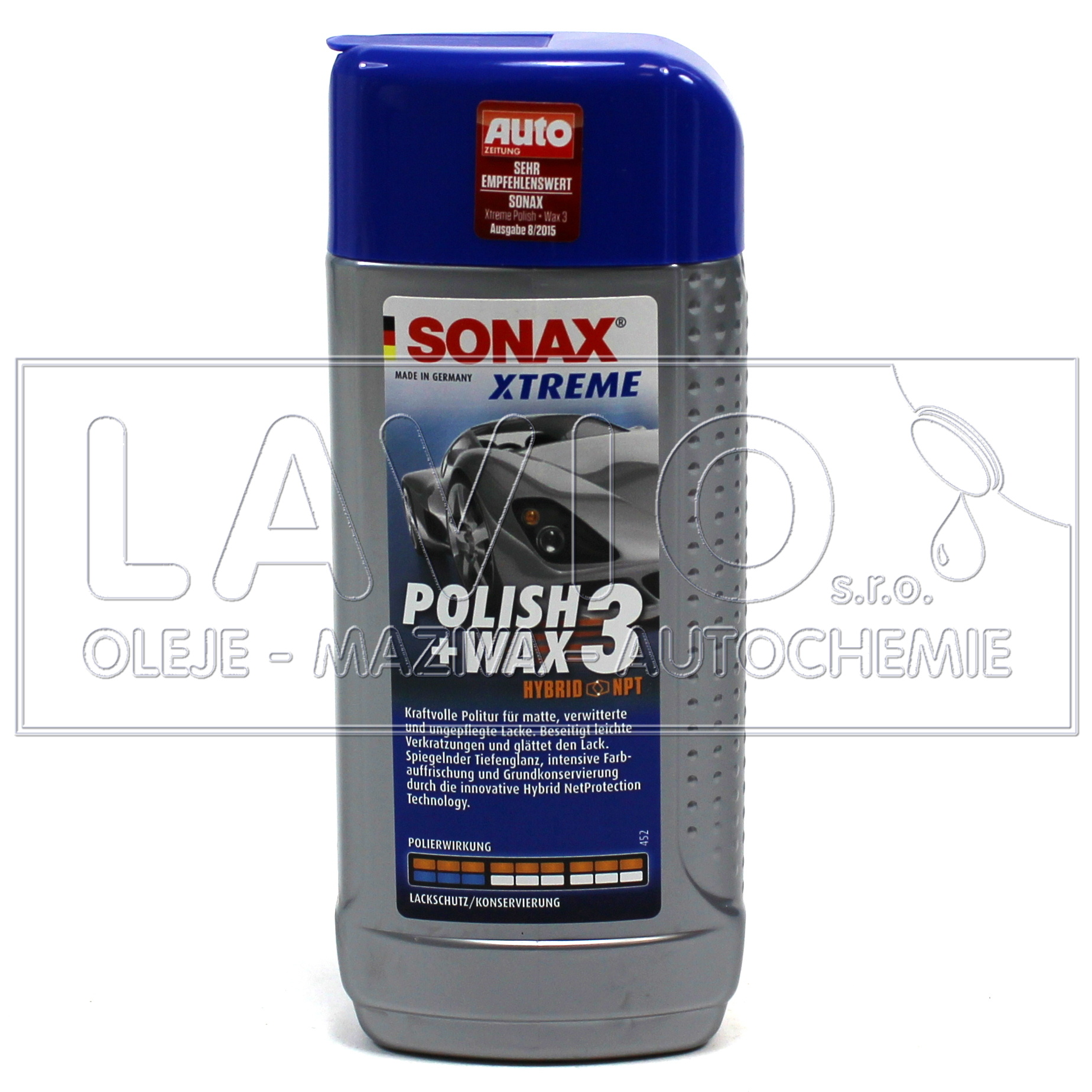 Leštěnka s voskem SONAX Xtreme Polish & Wax 3 pro ošetření silně narušených pastelových a metalických autolaků a lakovaných plastů. Vysoký obsah brusných částic šetrně odstraní poškozenou vrstvu laku, oživí barvy, navrátí původní lesk a dlouhodobě chrání. Při spotřebě cca 50 ml leštěnky na jedno ošetření vystačí balení na cca 5 ošetření laku s trvanlivostí (vysokým leskem) cca 2 měsíce.