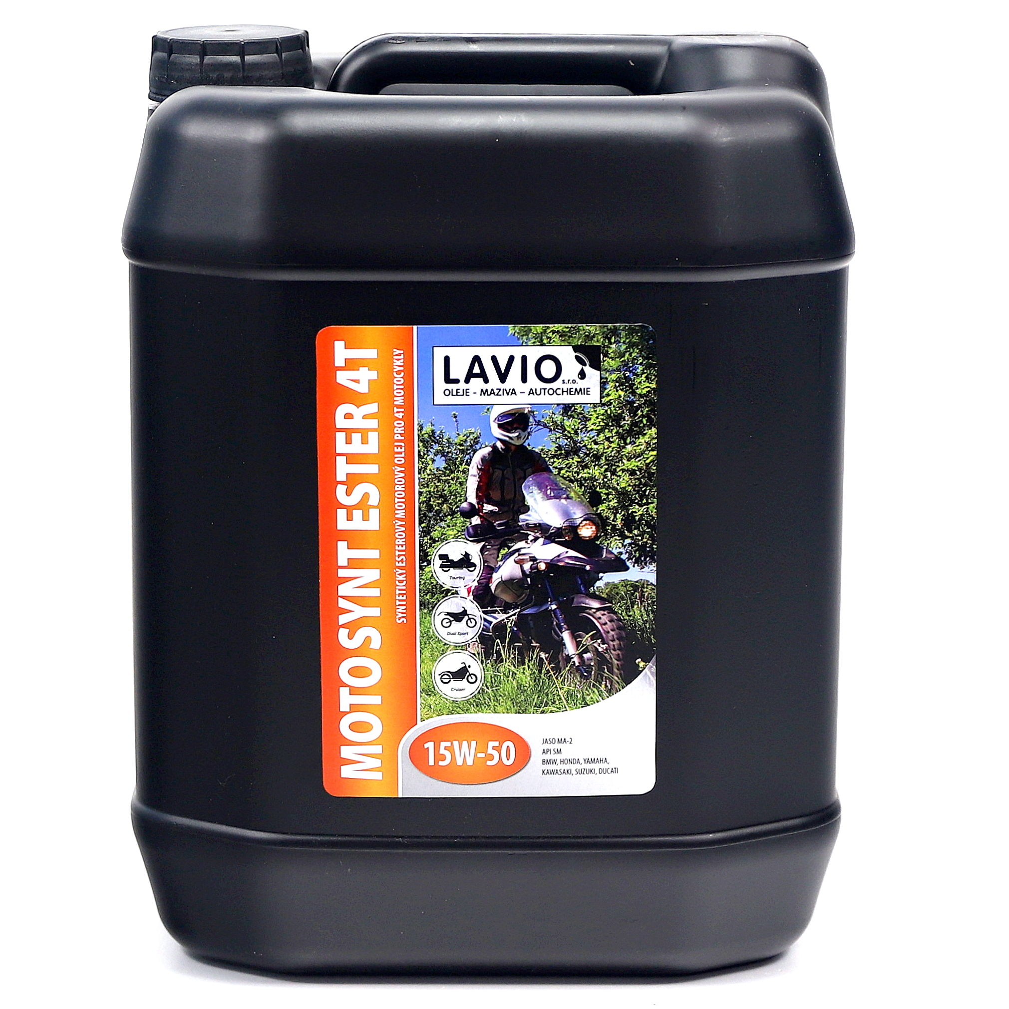 EN: Modern synthetic-ester SAE 15W-50 motorcycle engine oil designed for four-stroke motorcycles, pitbikes, enduro touring motorcycles, trial bikes, enduro motorcycles, scooters and ATV four wheelers. It provides very good protection of engine, gearbox and wet clutch used on four stroke motorcycles for cold starting and at high load and maximizes the reliability, shear stability and stability at high operating temperatures in the most challenging operating conditions. It is used in engines both with and without catalysts. It is suitable for normal everyday use and ensures perfect lubrication and ideal engine cleanness. Its good thermooxidation stability minimizes formation of deposits and contamination. Special anti-wear additives protect important engine and transmission parts. Controlled friction properties eliminate clutch slipping which enables trouble-free gearing, high output and trouble-free engine running. Suited for BMW, HONDA, YAMAHA, KAWASAKI, SUZUKI, DUCATI and other motorcycles depending on the specifications.
