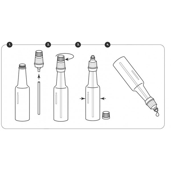 - Pomalým tlakem na plastovou lahvičku naplňte dávkovací hlavu žádaným množstvím aditiva a následně nalejte aditivum do nádrže vozidla.